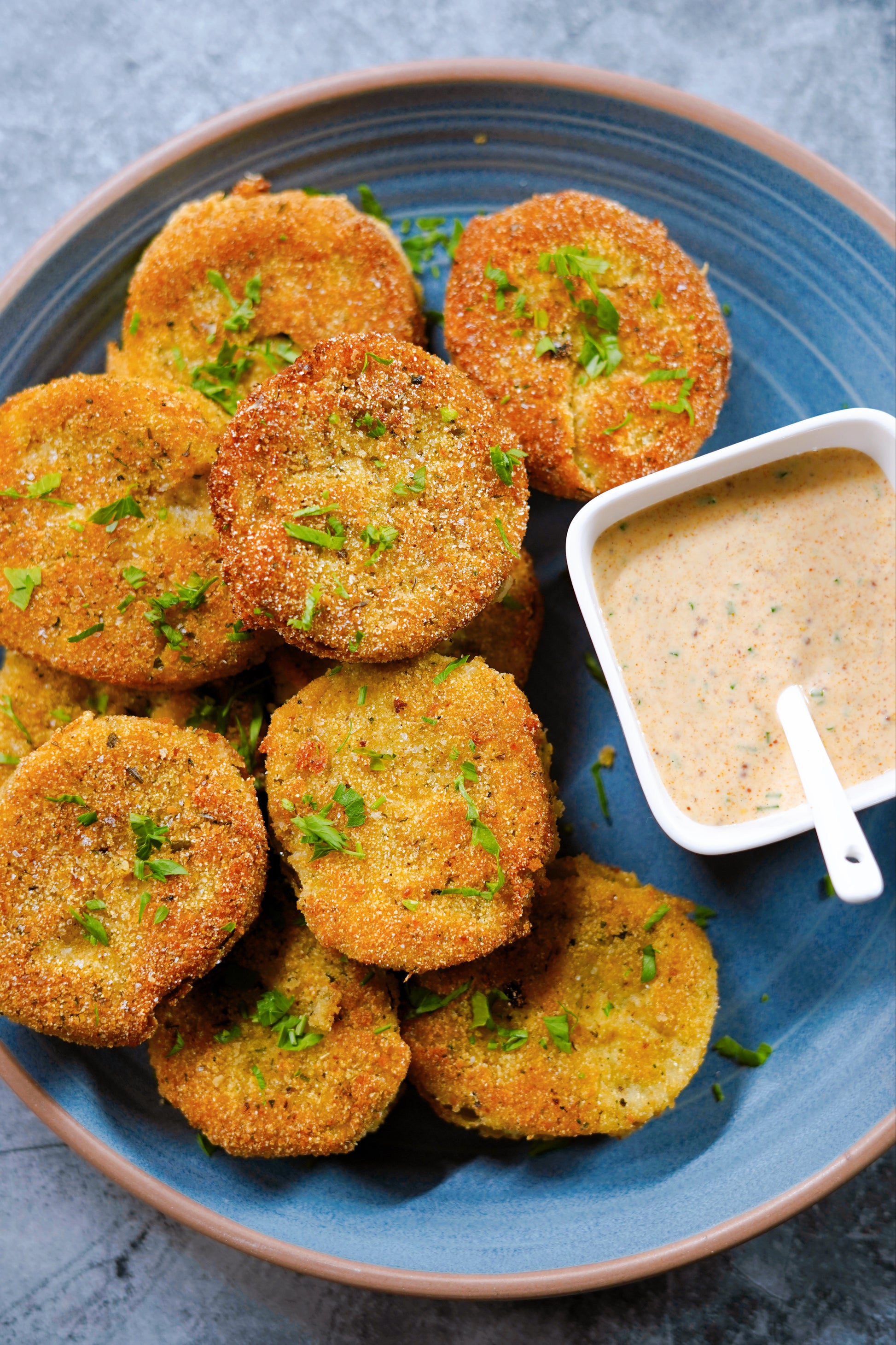 Paner les rondelles de tomates à l’anglaise : farine → œuf → chapelure. Répéter œuf → chapelure pour plus de croustillant. Frire immédiatement dans une poêle d’huile chaude à intensité moyenne, environ 1 min par côté. Égoutter sur papier absorbant et saler aussitôt.