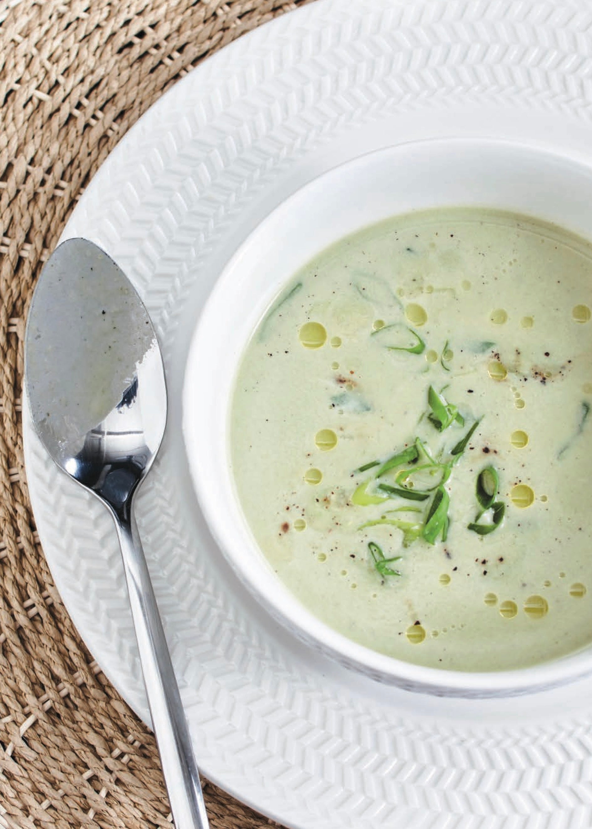 Réduire le tout en purée lisse au pied-mélangeur. Poivrer, garnir avec l’oignon vert ciselé, et servir aussitôt.