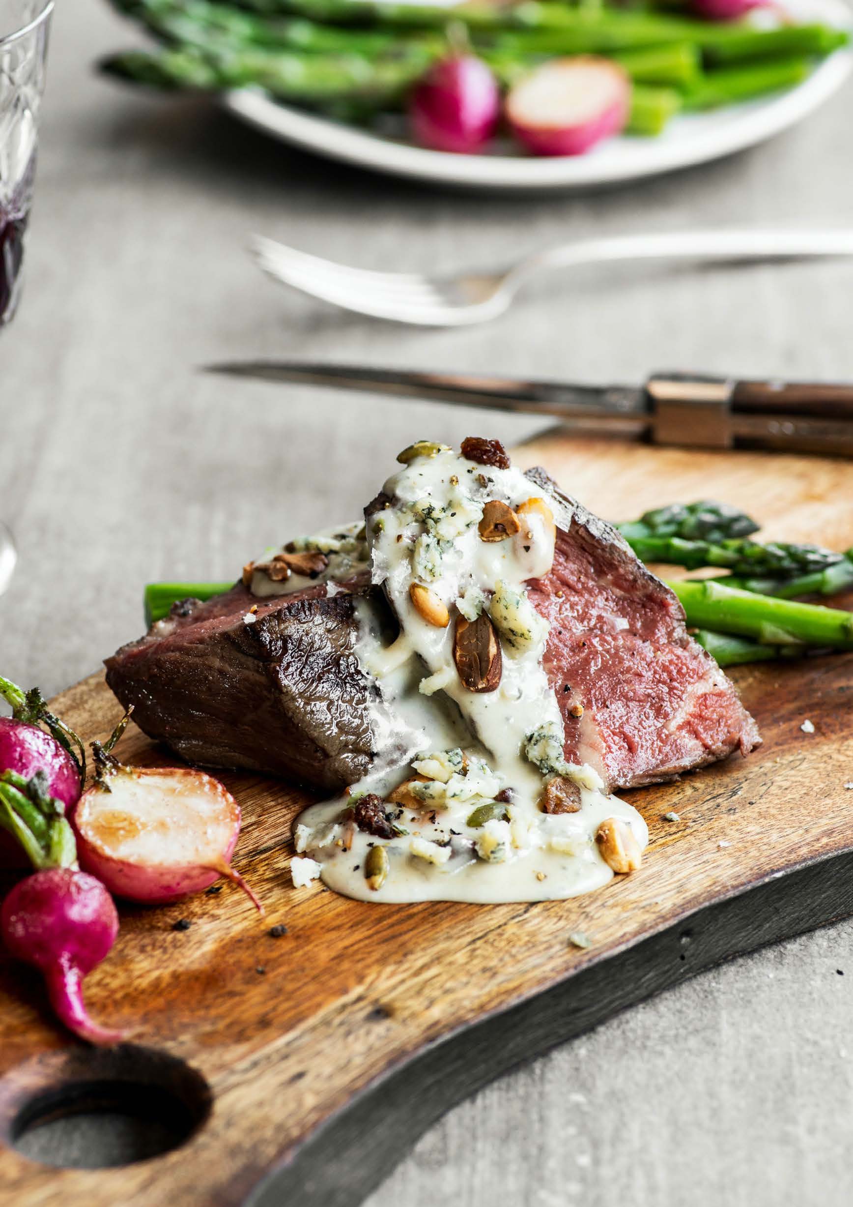 Filet de bœuf poêlé, crémeuse de bleu et noix