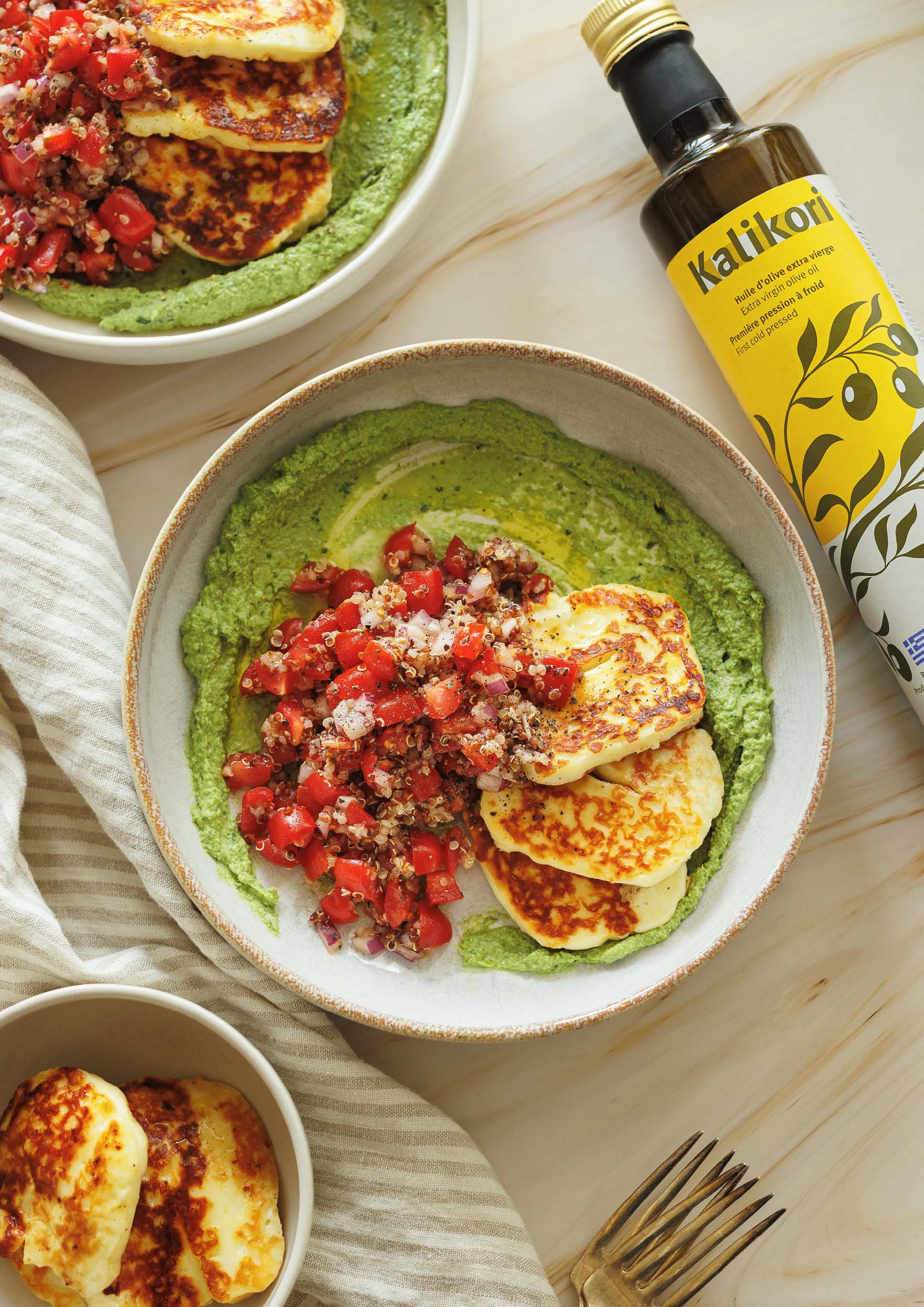 Dans quatre assiettes, répartir et étendre la sauce. Répartir la salade et le halloumi. Servir.