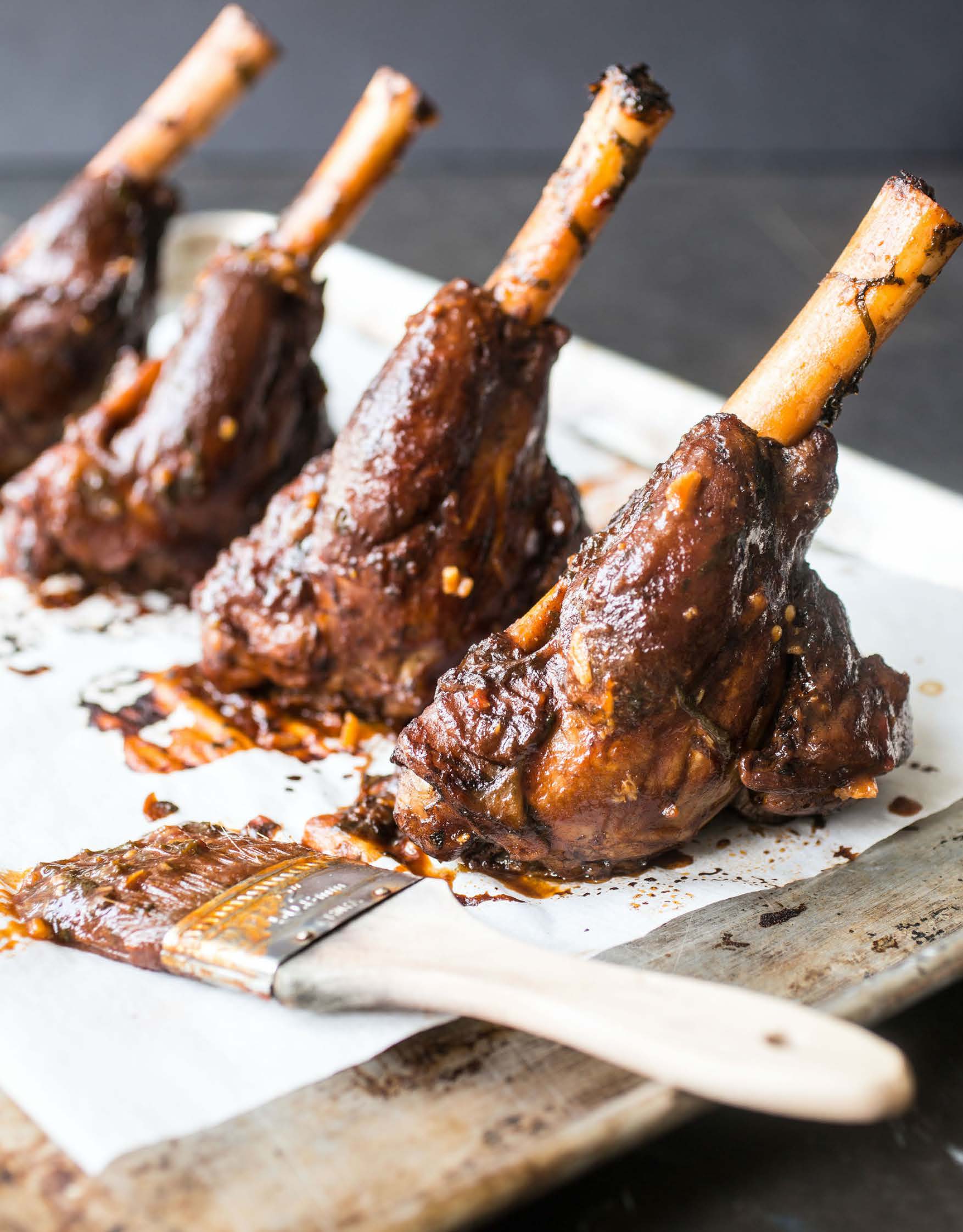 Jarret d’agneau braisé, glacé au coulis de tomate épicées et à la menthe fraîche