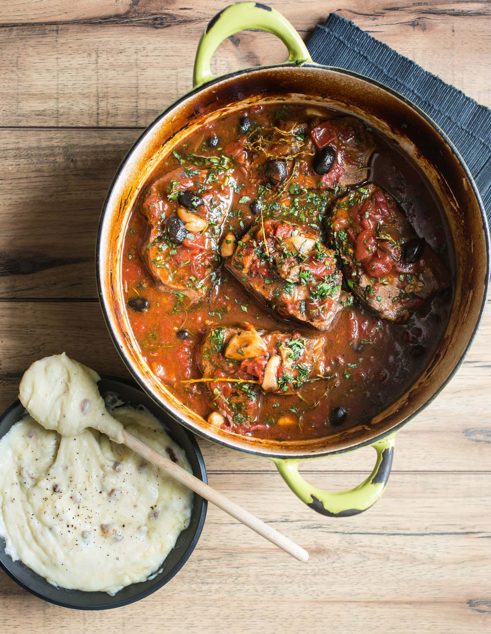 Ajouter les tomates, les olives, le fond de veau, les herbes salées, le romarin et le thym.