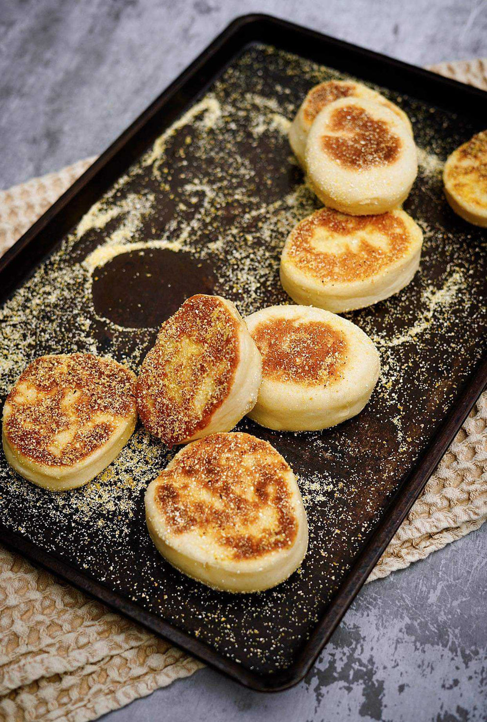 Fariner le plan de travail avec la semoule de maïs. Abaisser la pâte à 1,25 cm (½ po) d’épaisseur. Découper 16 cercles à l’emporte-pièce. Saupoudrer de semoule, couvrir d’un linge humide et laisser lever 30 à 45 min.