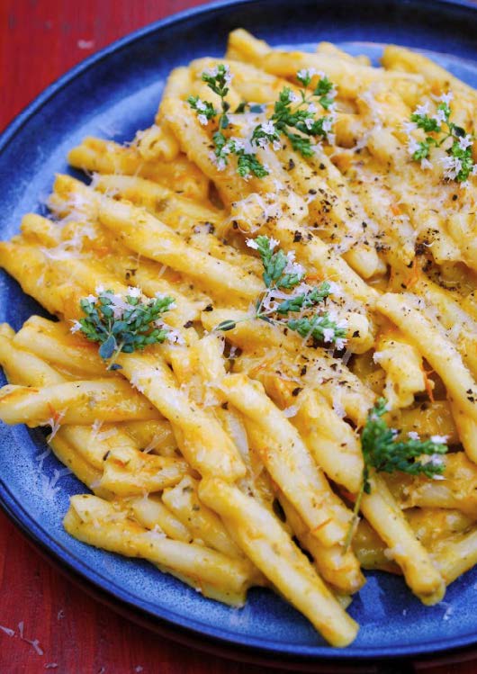 Transférer dans un contenant plus étroit et réduire en purée au pied-mélangeur. Ajouter le basilic et le parmesan. Rectifier l’assaisonnement et ajouter de l’eau de cuisson si nécessaire pour détendre la sauce. Verser sur les pâtes chaudes, touiller et servir aussitôt.