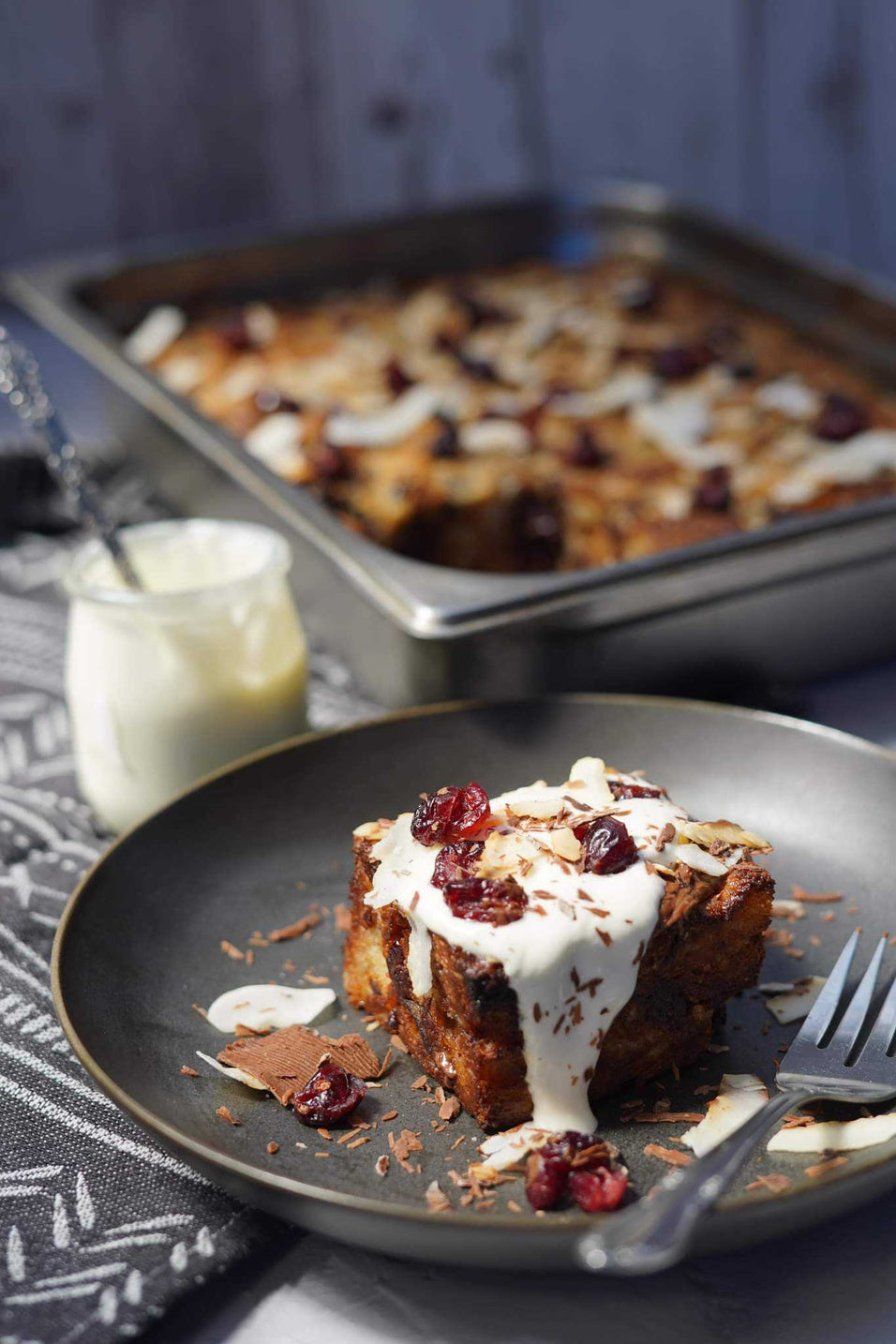 Pouding au pain au chocolat noir, canneberges et noix de coco