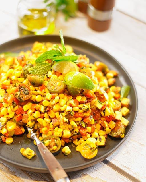 Salade tiède de maïs, tofu fumé et fromage halloumi