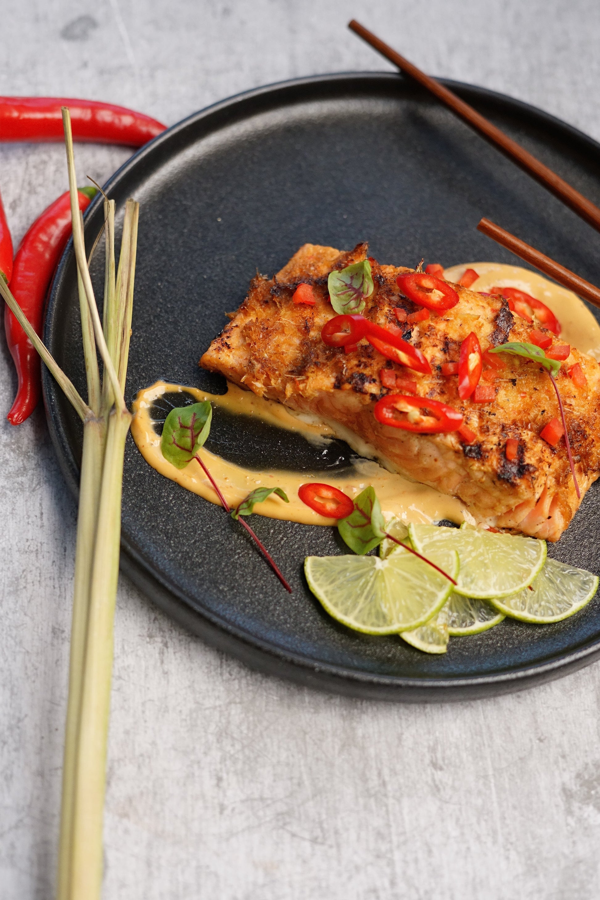 Servir sur un plat de service, garni de quartiers de citron vert et de feuilles de coriandre. Accompagner de riz, légumes grillés ou salade.